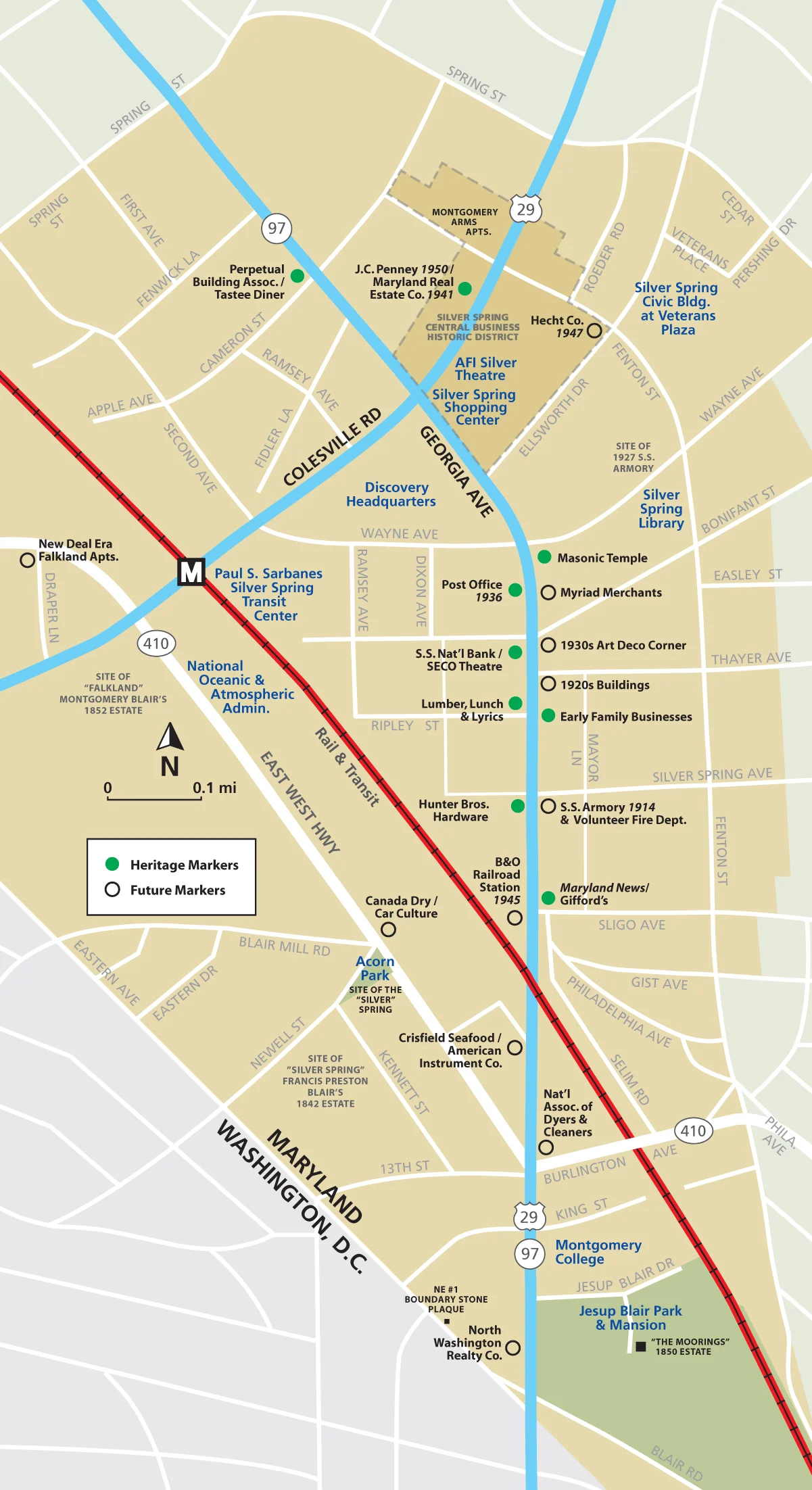 Silver Spring’s original Baltimore & Ohio Railroad station, built in 1878, formed the nucleus from which today’s community radiated. Many of these early-to-mid 20th century buildings still grace Colesville Road, Georgia Avenue, and their side streets. Explore the area and discover the fascinating history of the pioneering entrepreneurs, businesses, and institutions that developed our vibrant and diverse community.